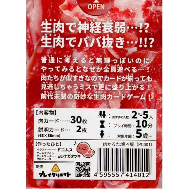 「肉かるた」は全面が生肉のカードを使って、肉かるた、神肉衰弱、肉抜き(ジジ抜き)の3種のゲームを楽しめるカードゲームです。