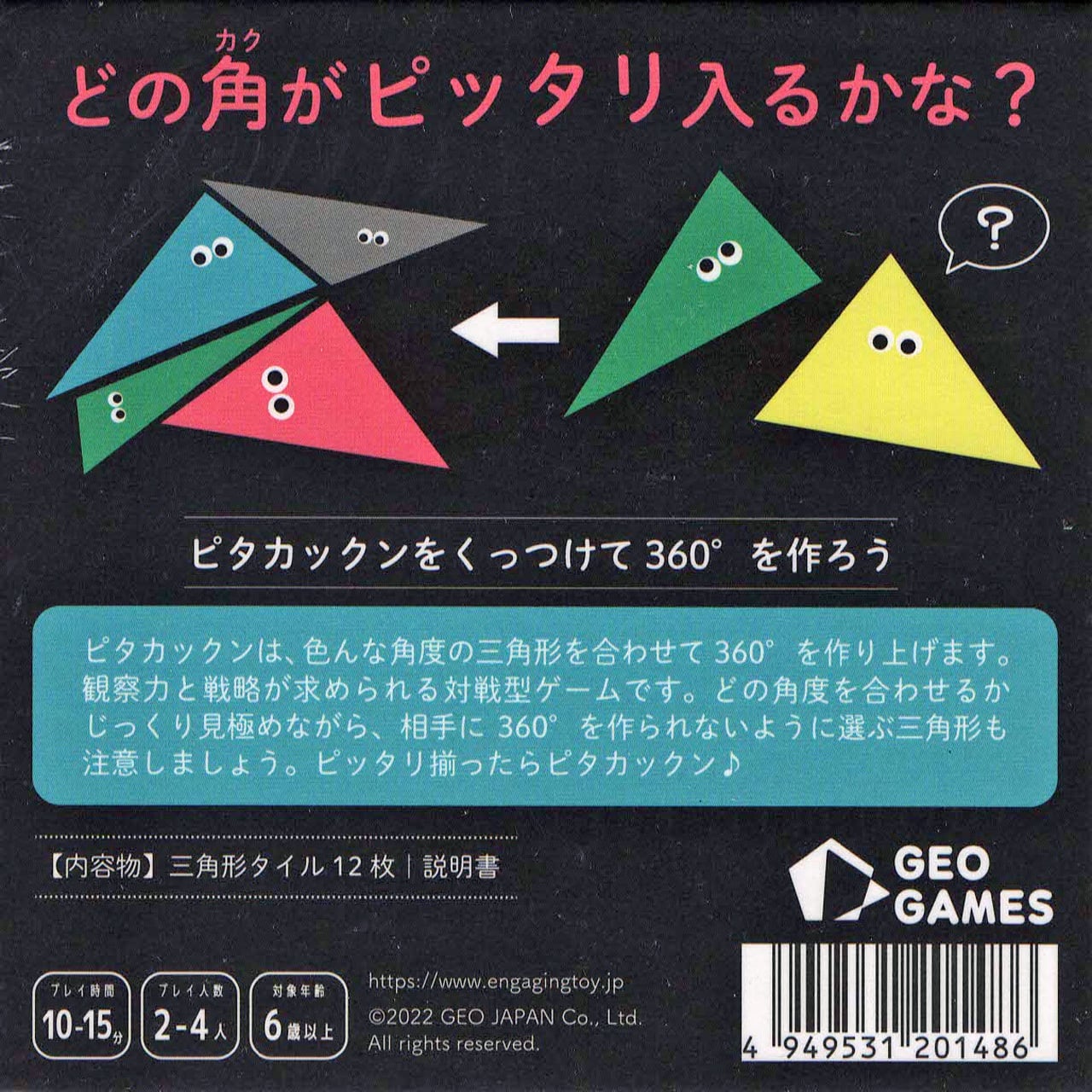 ピタカックンは、色んな角度の三角形を合わせて 360°を作り上げます。観察力と戦略が求められる対戦型ゲームです。どの角度を合わせるかじっくり見極めながら、相手に360°を作られないように選ぶ三角形も注意しましょう。